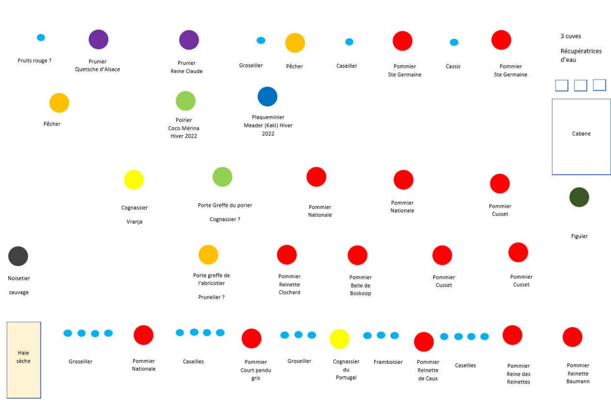 Nous avons aussi profité de notre rencontre pour arroser les jeunes fruitiers. Ils ont bien repris... sauf les poiriers qui semblent peiner. Nous allons suivre leur évolution.Côté fruits, les pommiers sont plutôt bien chargés, un éclaircissage pourrait être envisagé si nous voulons des fruits plus gros. Personnellement, je me contente de la taille qu'elles auront sans éclaircissage. Qu'en pensez-vous? Nous aurons aussi quelques pêches visiblement mais très peu de prunes et pas de coings.